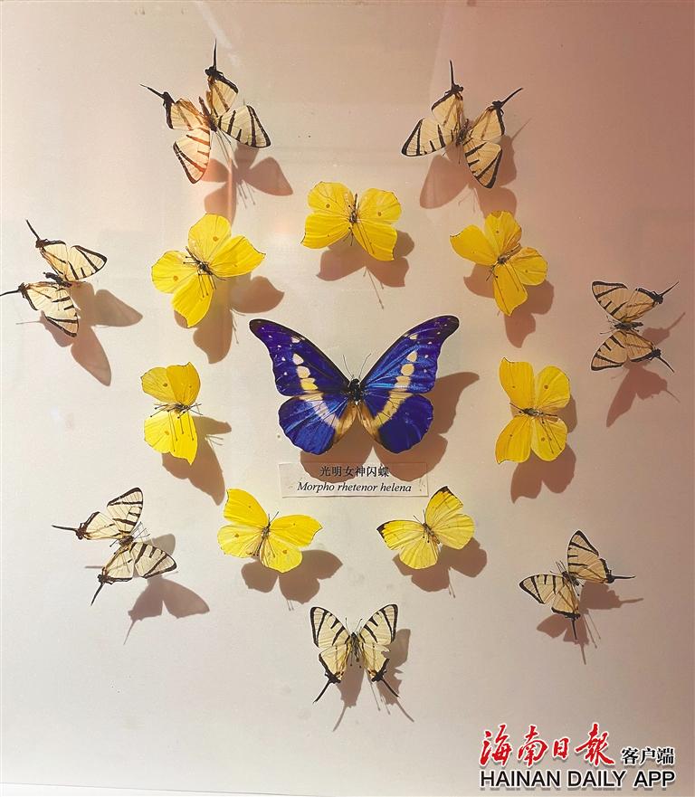 記者在現場看到,展覽館面積不大,約200平方米,平面呈長方形,屋頂為金字形瓦面,下鋪實木板,能起到隔熱和美觀的效果;蝴蝶標本主要沿四壁展示,分為16個板塊,先從動物分類、蝴蝶與蛾類的區別、蝴蝶的生活史開始介紹,并在一張中國地圖上于不同省份的位置安上當地的代表種蝶類的標本,在“海南島”上,就有一只金斑喙鳳蝶。
